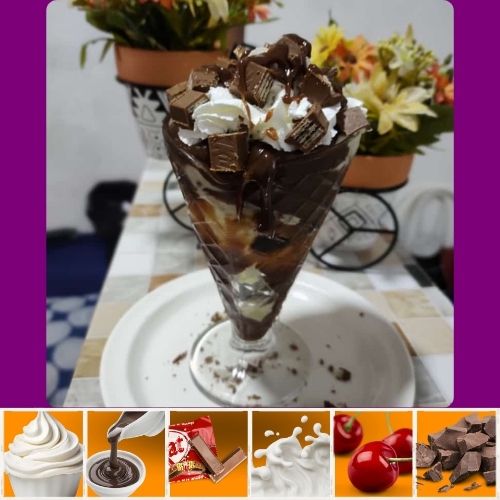 Creme trufado + Kit Kat + calda de chocolate + chantininho e cereja.